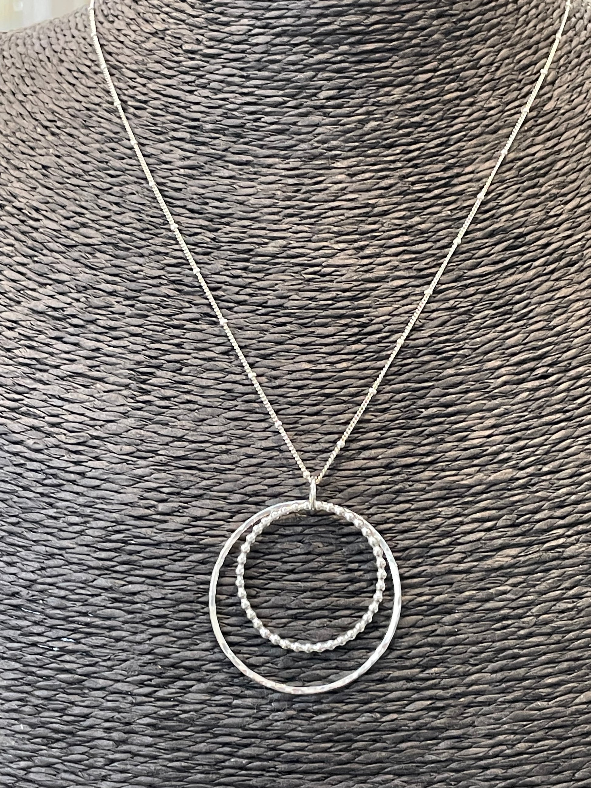 Handmade Sterling Silver Duo Circles pendant is made from recycled silver with both bobbled & plain silver on an 18” Satalite chain.
